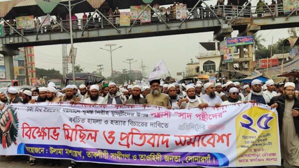 আলআমিন কবির, সোনারগাঁও (নারায়ণগঞ্জ): বিশ্ব ইজতেমার মাঠে গভীর রাতে ঘুমন্ত মুসল্লিদের উপর সা’দপন্থীদের বর্বর হামলা চালিয়ে হত্যার বিচার ও সা’দপন্থীদের তাবলীগ নিষিদ্ধের দাবিতে নারায়ণগঞ্জের সোনারগাঁওয়ে বিশাল বিক্ষোভ মিছিল ও প্রতিবাদ সমাবেশ বিস্তারিত