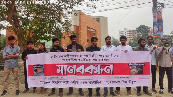 তাসনীমুল হাসান মুবিন, নজরুল বিশ্ববিদ্যালয় : বিশ্ববিদ্যালয় ক্যাম্পাসে সাংবাদিকদের ওপর ছাত্রলীগের হামলার প্রতিবাদে মানববন্ধন করেছে জাতীয় কবি কাজী নজরুল ইসলাম বিশ্ববিদ্যালয়ে কর্মরত সকল সাংবাদিক ও সাধারণ শিক্ষার্থীবৃন্দ। আজ (৬ ফেব্রুয়ারি) বিস্তারিত