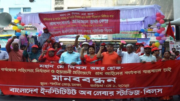 মহান মে দিবস উপলক্ষে বাংলাদেশ ইনস্টিটিউট অব লেবার স্টাডিজ-বিলস এর উদ্যোগে আজ ১ মে ২০২৪ বুধবার জাতীয় প্রেসক্লাবের সামনে এক মানববন্ধনের আয়োজন করা হয়। মানববন্ধনে সংহতি প্রকাশ করে বক্তব্য রাখেন বিস্তারিত
