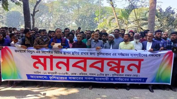 মোঃ নাঈমুজ্জামান নাঈম, নিজস্ব প্রতিবেদক: কিশোরগঞ্জের কুলিয়ারচর উপজেলায় জনস্বার্থে বিদ্যুৎ এর প্রিপেইড মিটার স্থাপন স্থগিত রাখার জন্য কুলিয়ারচর এর সর্বস্তরের ব্যবসায়ীদের পক্ষ থেকে মানববন্ধন ও সমাবেশ অনুষ্ঠিত হয়েছে। রবিবার (১২ বিস্তারিত