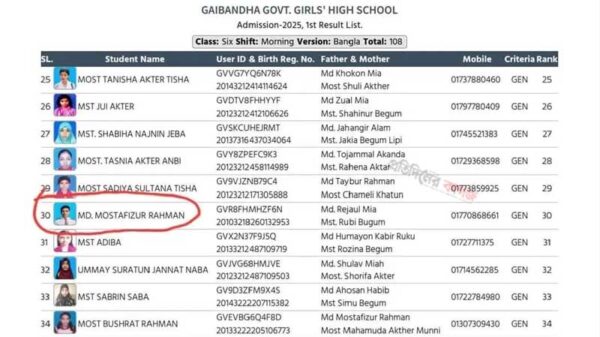 তামজিদ ইসলাম তন্ময় মোল্লা : ২০২৫ শিক্ষাবর্ষে সরকারি ও বেসরকারি মাধ্যমিক বিদ্যালয়গুলোর প্রথম থেকে নবম শ্রেণি পর্যন্ত ভর্তিতে ডিজিটাল অনলাইন লটারির ফলাফল প্রকাশ করা হয়েছে। এতে গাইবান্ধার একটি বালিকা বিদ্যালয়ের বিস্তারিত
