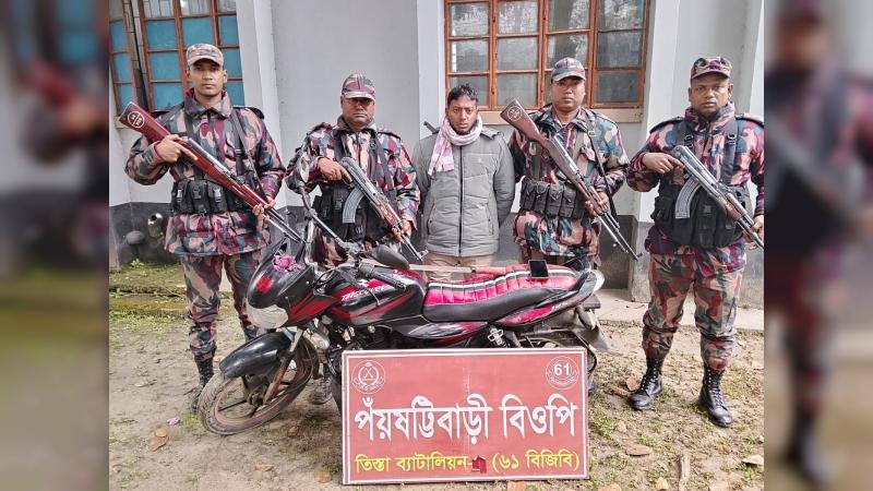 ৬১ বিজিবির তিস্তা ব্যাটালিয়নের প্রেস বিজ্ঞপ্তিতে জানানো হয়েছে, বিজিবির বিভিন্ন চোরাচালান বিরোধী অভিযানে মোটরসাইকেল ও অস্ত্রসহ একজন ব্যক্তিকে আটক করে মালামাল পাটগ্রাম থানায় হস্তান্তরের কার্যক্রম প্রক্রিয়াধীন।