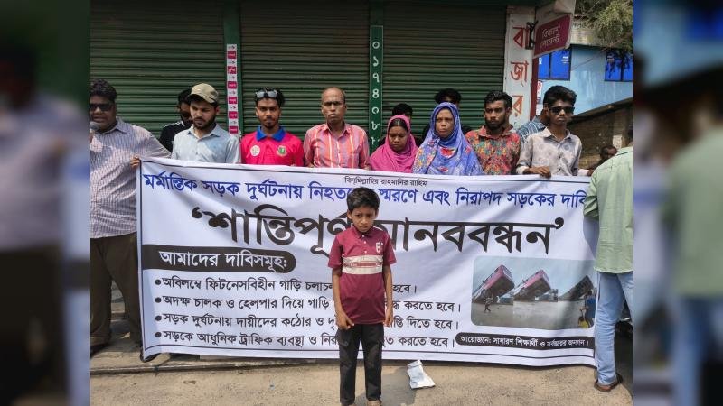 দৌলতদিয়ায় বাসডুবিতে নিহতদের স্মরণে এবং নিরাপদ সড়ক ও জেলা বাস মালিক সমিতির সিন্ডিকেটের প্রতিবাদে রাজবাড়ীতে মানববন্ধন অনুষ্ঠিত হয়েছে।